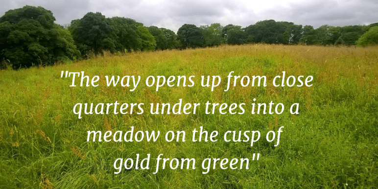 The next day – a birthday – we had come to the meadows from waterfalls where I’d sluiced my feet in sharp-cool water, and felt the touch of millenia in the peat-reddened rock and silt between my toes. I’d let abluvion wash the cares from world-weary bones. Now, under skies vastly blue, and standing in the midst of meadows pulsing with life, heat seethes over everything. It beats its velvet wings at the neck and limbs, as though it were a living thing itself; it crowds and sits like flannel in the mouth, and all the air is filled with the acrid tang of green growing things and dry dusts and grass seeds. The sun is a bright white disc above, with nowhere to hide from it in the wide-open cleft of the dale; fermenting the air to a heady cider in the blood. Everything about the meadows is wanting to get in: to get under the skin. It is oppressive and at the same time friending. I look on them as presiding mysteries. I want to chlorophyll up my lungs, and make them a little into my own chemistry.